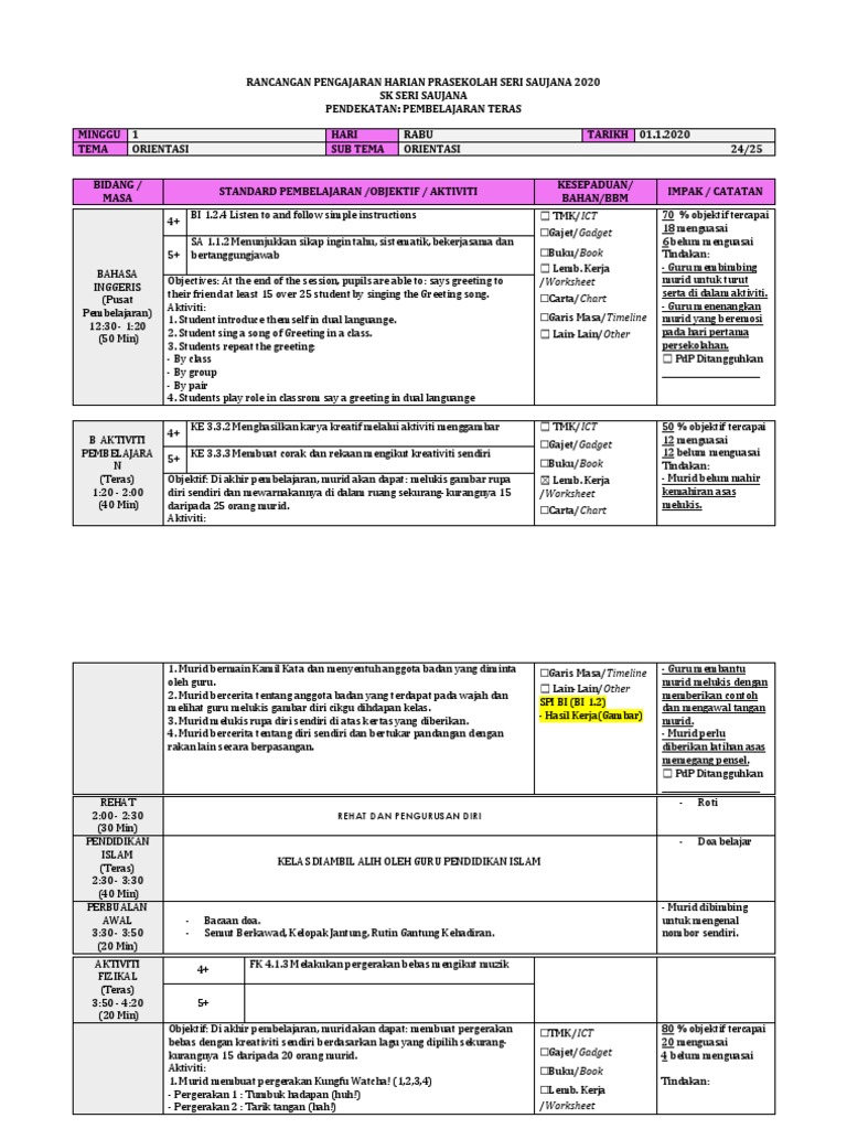 Rancangan Pengajaran Harian Prasekolah 2017 Englshmina